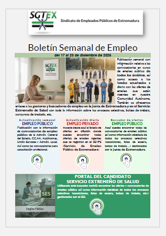 Publicación semanal con información relativa a las convocatorias en curso de empleo público de todos los ámbitos, así como acceso a los listados actualizados a diario con las ofertas de empleo que están vigentes en nuestra Comunidad Autónoma. También os ofrecemos enlaces a los gestores y buscadores de empleo en la Junta de Extremadura y en el Servicio Extremeño de Salud con toda la información sobre los procesos selectivos, bolsas de trabajo, concursos de traslado, etc...
